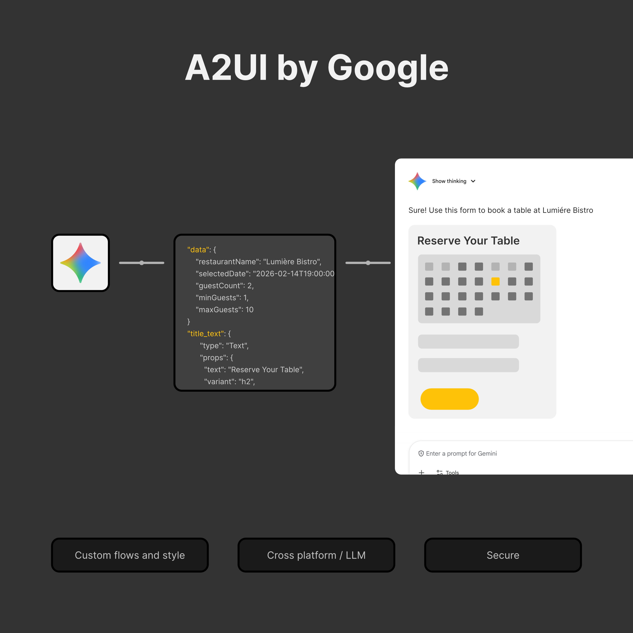 Think of it like this: instead of an agent saying "here's some JavaScript to run," it says "here's a form with three fields, a date picker, and a submit button." Your app renders that using your own styled components, in your own visual language, with your own security controls.
